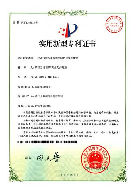 ZL 2009 2 0121493.9 一種疏水締合聚合物溶解熟化攪拌裝置